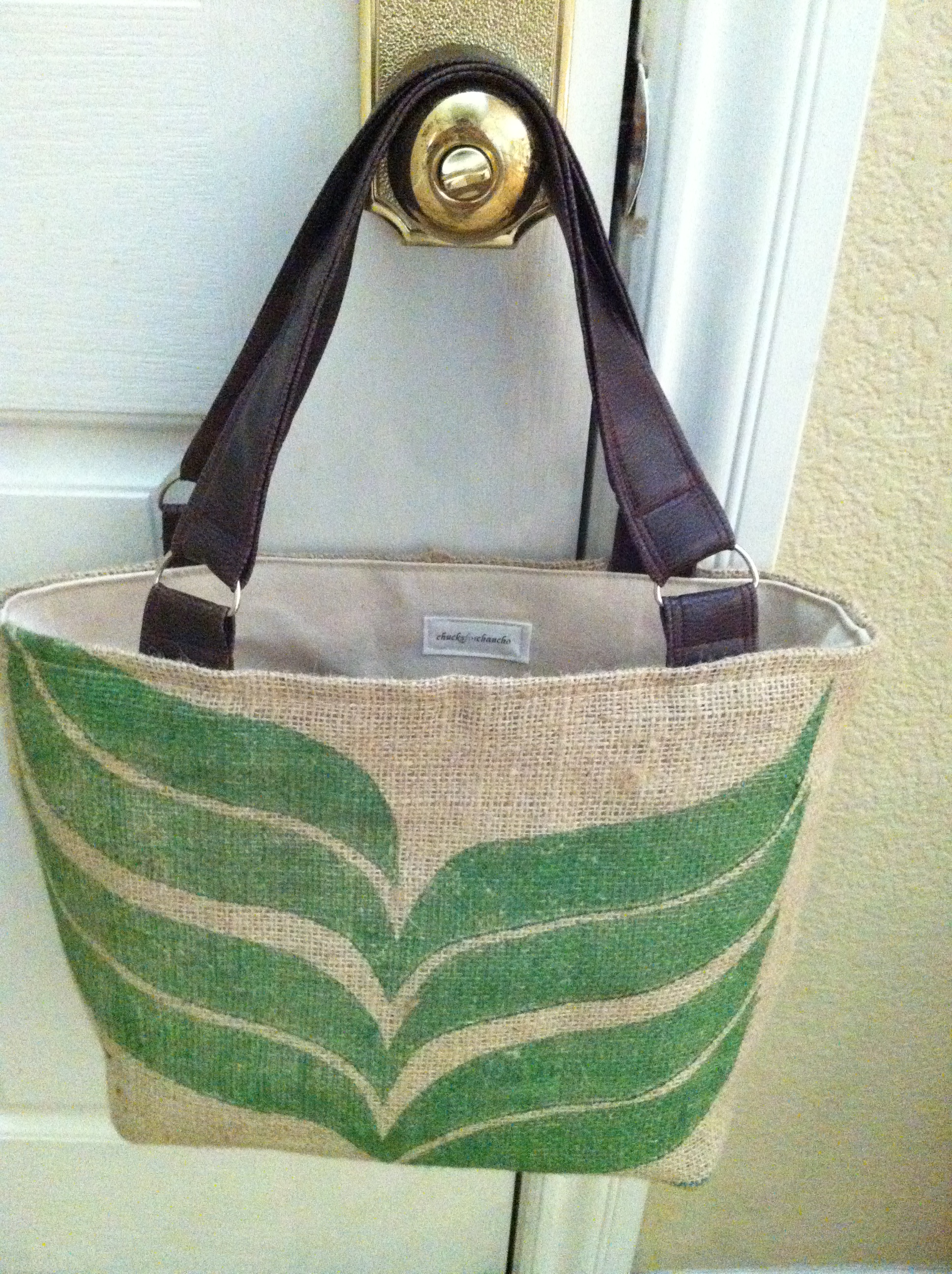 Here is my latest labor of love.  Large Central American burlap coffee sacks  upcycled into a must have summer tote!  I love that every coffee sack is unique with different markings and stamps so no one bag is exactly the same.  The size of the sacks allow enough burlap fabric for 2 tote bags.  Burlap can be cumbersome to work with because its such a coarse fabric but a heavy-duty sewing needle, upholstery thread, and some ‘not so fancy scissors’ proved to be exactly what I needed.  Another con about working with the burlap is that along with my cutting table and machines being covered in the tiny sharp fibers, by the end of the day I was also completely covered in them!