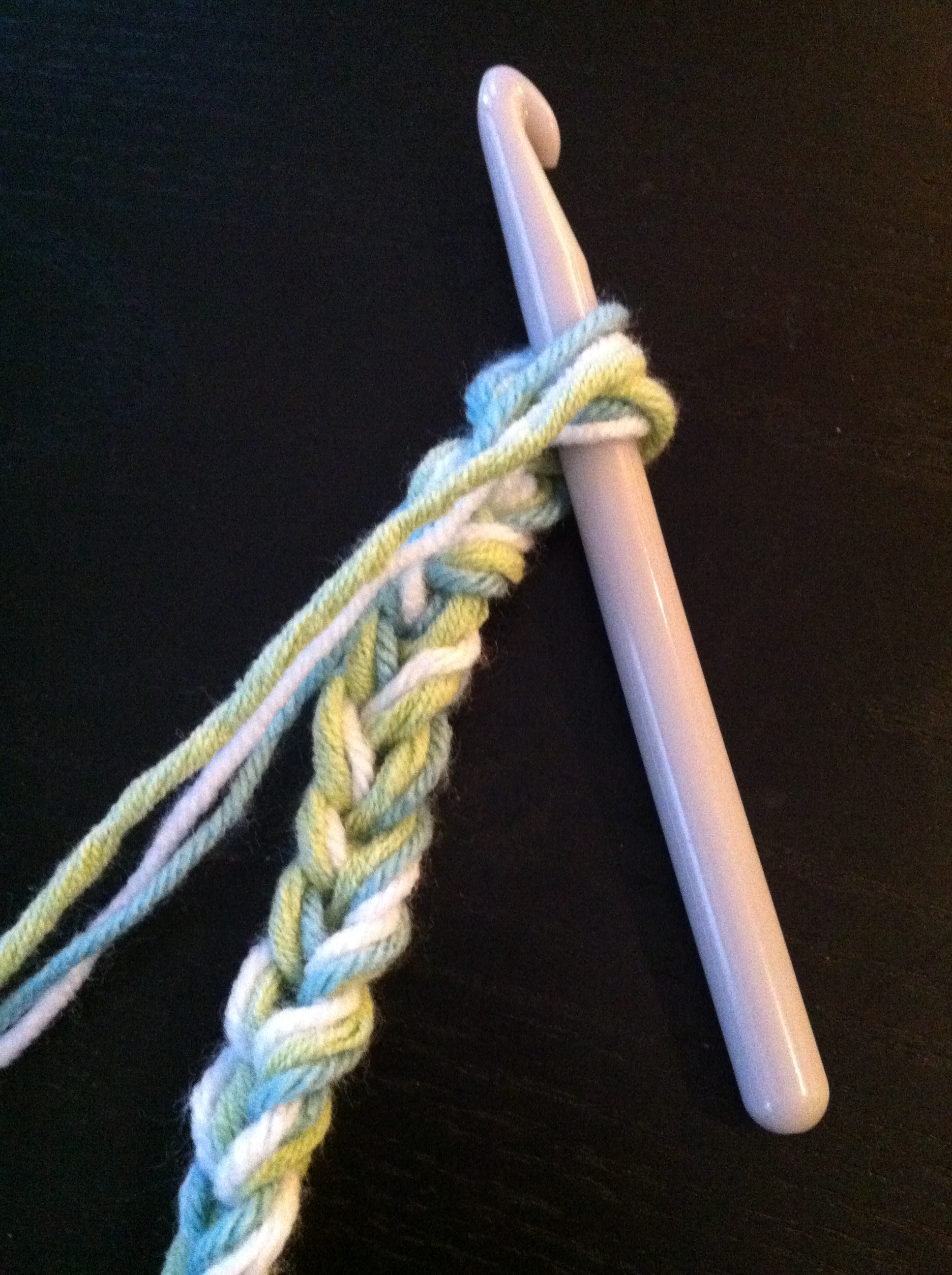 Starting with all 3 yarns together, I chained until the length measured about 34″.  (Number of chains will vary depending on yarn being used)