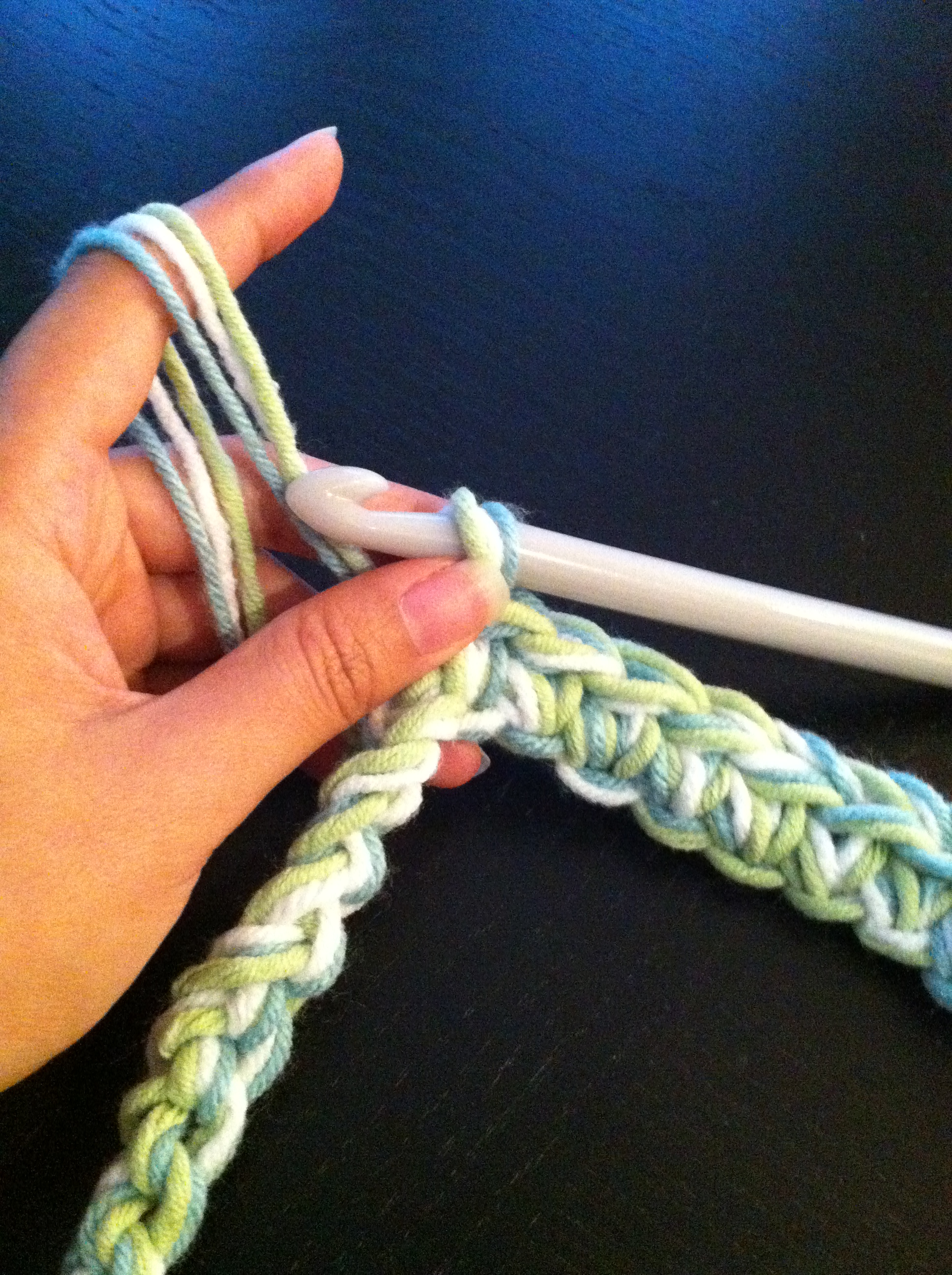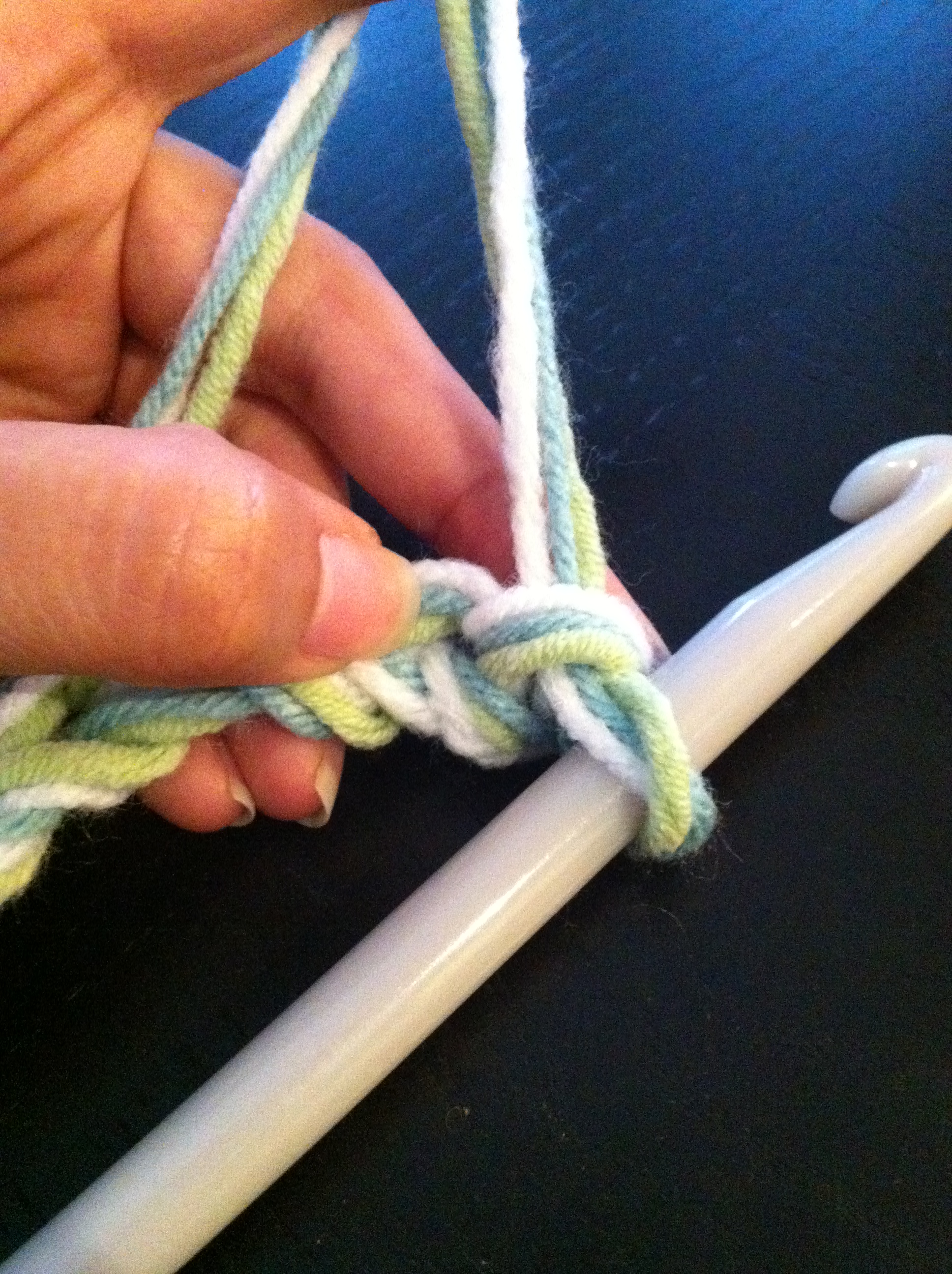 1. When you have enough yarn of one color left to make 1 1/2 – 2 stitches with Take the new strand of yarn and crochet as usual (So you will be using 4 strands for at least 1 1/2 to 2 stitches) Works very well and holds up just as well as knotting without showing big bulky knots or frayed out ends. Im not sure if this is what everyone does but it was how I was taught and it works great for me 🙂